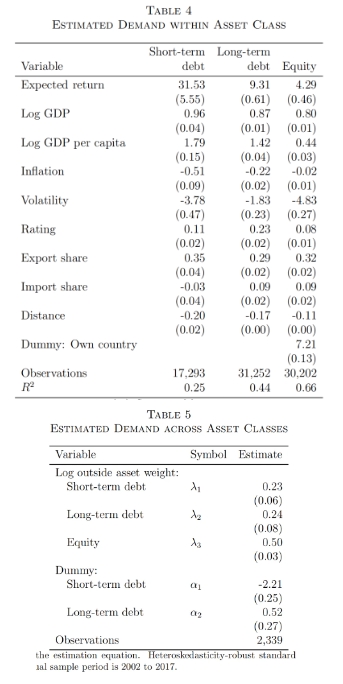 为了缓解内生性问题,作者选择了一系列宏观变量:投资国外部财富、资产发行国GDP、资产发行总量和双边距离作为资产收益率的工具变量。国家和资产层面控制变量包括主权债务评级、双边贸易占比、通胀率等。资产内需求系数和资产间替代弹性估计结果如下:
