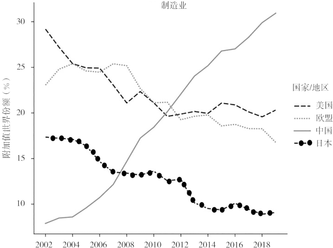图11 2002—2019年全球主要经济体技术密集型产业增加值