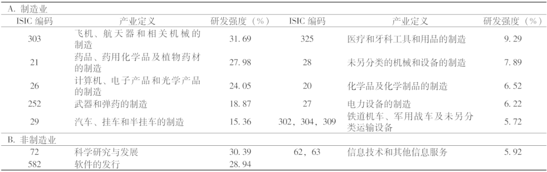 产业升级是中国实施制造强国的战略性目标,《中国制造2025》制定的战略目标要求(中国)“到2020年,基本实现工业化,制造业大国地位进一步巩固,制造业信息化水平大幅提升……到2035年,我国制造业整体达到世界制造强国阵营中等水平……新中国成立一百年时,制造业大国地位更加巩固,综合实力进入世界制造强国前列”。《中国制造2025》着重强调了创新在产业升级中的关键性作用,并将规模以上制造业研发经费内部支出占主营业务收入比重(研发强度)和规模以上制造业每亿元主营业务收入有效发明专利数作为战略目标的头两个考核指标。经济与合作发展组织(OECD)根据国际标准产业分类(ISIC)对产业层面的研发强度做了五个层级的划分,美国国家科学基金会(NSF)在此基础上把研发强度最高的两个层级的产业定义为知识和技术密集型产业(Knowledge- and Technology-Intensive Industries)如表3所示。在排除粮食、能源和服务业等非制造业出口外,劳动密集型产业和技术密集型产业基本包含了中国剩余所有的出口产业。