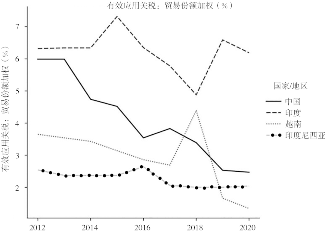 1995年世界贸易组织的成立推动了全球贸易自由主义里程碑式的发展,世界贸易组织最重要的作用之一是其成员贸易关税的削减。对于国家进口关税平均水平存在两种测度:第一种测度是协议关税水平,体现为应用最惠国关税(MFN)的简单平均,这一测度反映了一个国家的事前贸易政策制定情况;第二种测度是有效应用关税(使用贸易份额加权),这一测度反映了一个国家的事后贸易政策结果。由于协议关税的提高会影响降低进口量,进而降低其在关税总额中的权重。贸易份额加权的有效应用关税水平一般低于协议关税水平。