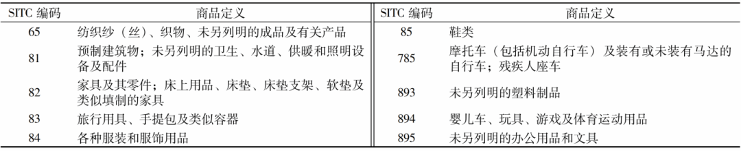 本文使用Hanson基于国际贸易标准分类编码(SITC)对于中国劳动密集型产业的分类,将表1中的十类商品定义为劳动密集型产业。为了测度一国在劳动密集型产业上的比较优势,参考Hanson的做法,本文采用Balassa提出的显示性比较优势(RCA)指标,如公式(1)所示: