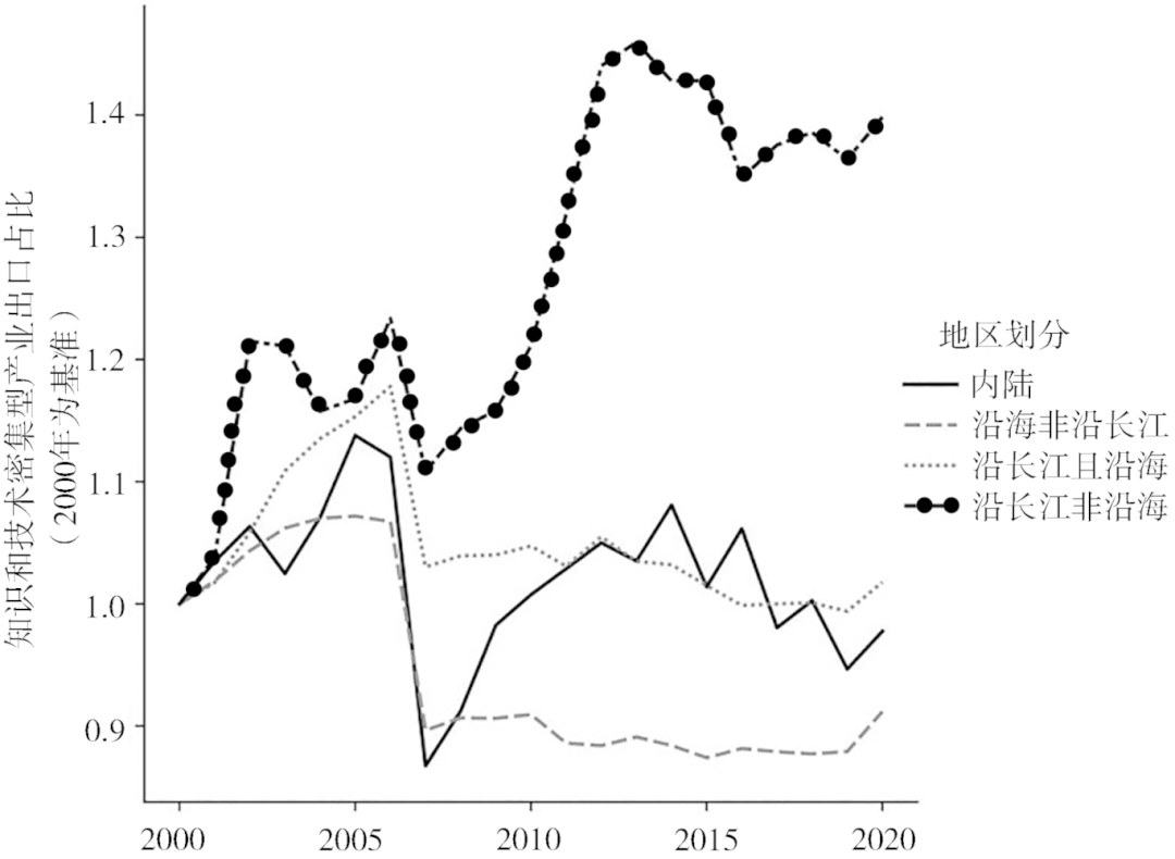 前文分析了构成中国劳动密集型产业韧性的外因。另一方面,我们认为构成中国劳动密集型产业韧性的内因来自中国超大规模的经济体量、区域经济发展差异和广袤的内陆纵深。与许多已有区域增长(regional growth)和结构转型(structural transformation)文献不同的是,我们认为中国的内部产业转移除了东西向的“南北结构转型”,即随着东部沿海城市的结构转型和产业升级将劳动密集型向西部地区进行转移外,更重要的是内陆地区本身依据比较优势资源重新配置的效应。在前文中,我们引入关税讨论了世界贸易自由化带来的资源配置效应,在本节中我们将把视野转向国内,把长江这一天然且极为重要的区域性基础设施禀赋作为工具以分析2000年中国全面加入全球化资源再分配以来的内部产业转移与资源配置问题。在表2中我们按照传统的东中西部地区和是否沿海或沿长江对中国的各省份进行地区划分。图8展示了以2000年水平为基准的中国各地区劳动密集型出口份额。图8为我们提供了两条重要的信息。(1)2000年以来中国劳动密集型产业出口增长最快地区是中西部地区和沿长江非沿海地区,其中沿长江非沿海地区劳动密集型产业在2020年的份额达到了2000年的2.6倍。(2)传统理论所预期的大规模东西向转移没有发生,东部地区的劳动密集型产业份额相对较为稳定,2020年东部地区相比2000年的劳动密集型产业份额仅下降9%,其中产业结构最先进的沿长江且沿海地区2020年的劳动密集型产业份额相比2000年还增加了7%。我们认为,东部地区并没有发生大规模产业转移的一个原因是东部地区对劳动节约型技术的开发和应用,我们会在讨论中国的地区技术进步方向时回到这一点。除了东部地区的部分产业转移外,中国内陆的劳动密集型产业转移依据比较优势而进行的资源再配置,体现为东北部地区向中西部地区的产业转移,非沿长江内陆地区向沿长江地区的产业转移。长江作为地理上的天然纽带沟通了沿海地区和内陆地区的产业链上下游,连接多个省份的内河航运带来的供应链优势形成了沿长江非沿海的中西部地区在外向型产业上的强大比较优势。一方面,东部沿海地区的劳动密集型产业根据产业链和供应链的上下游关系自然地会选择沿江向上游转移;另一方面,这种比较优势的吸引力同样推动了中国转向外向型经济以来内陆的劳动密集型产业向沿江地区转移。这种外向型经济下基于比较优势的资源重新配置构成了中国劳动密集型产业韧性的内因。