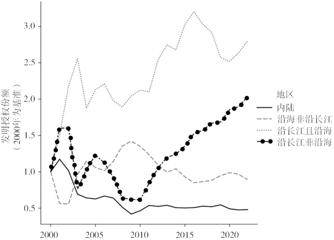 图17 2000—2022年分地区广延边际技术授权份额(2000年标准化为1)