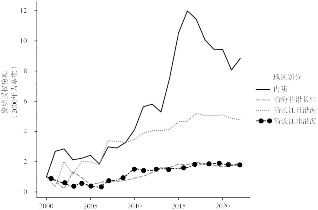 接下来,我们对这两种技术进步在中国的地区分布进行讨论。图16中展示了中国分地区的劳动节约型技术进步趋势。可以看到,劳动密集型产业沿长江地区集聚是推动劳动节约型技术进步的最主要表现。自2000年以来,相比于内陆地区快速推进广延边际技术进步的结构转型,东部尤其是劳动力成本压力较高的沿海且沿长江地区在2000年劳动节约型技术授权份额仅为5%,这一比例在2022年提高至15%,成为中国第二大的劳动节约型技术授权地。沿长江非沿海地区的劳动节约型技术份额则在金融危机后快速增长,从2.2%提高至7.3%。由图17可见,相比沿长江地区在金融危机后对劳动节约型技术进步的倾向,内陆地区则完全转向了广延边际的新产业。在2000年,内陆地区是中国最大的劳动节约型技术授权地,占有21%的授权份额,这一比例在2000—2006年的贸易自由化时期快速缩小至10%。与之同时发生的是内陆地区的信息技术产业授权份额扩大了22倍,新能源相关产业扩大了3倍,并在2014年中国政府推动新能源产业政策后进一步扩大到了2000年水平的12倍。但是,正如我们前文所分析的,中国广延边际的产业升级和技术进步存在依赖外需和产业政策的问题,这一点在内陆地区的产业升级中更为明显。金融危机带来的外需萎缩直接使得内陆地区的信息技术产业授权份额减少了三分之一,而2018年开始的新能源产业补贴退坡则使得内陆地区相关产业授权份额减少了27%。依赖产业政策的广延边际的技术进步除了受到政策本身不确定的影响外,还会加深企业的策略性创新行为,扭曲创新激励。如何用好产业政策,平衡地区技术进步差异,将会是未来中国产业升级需要解决的重要问题。