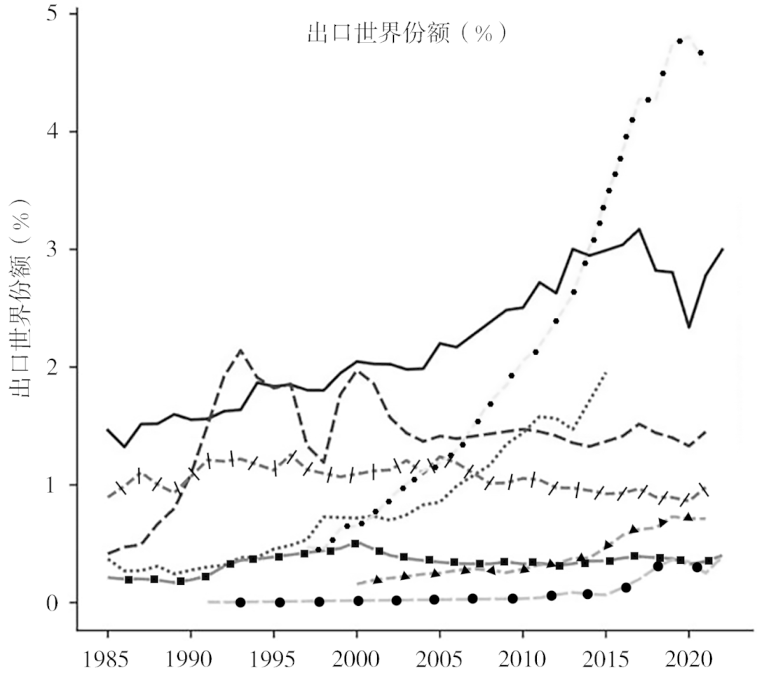 图3展示了中国和“亚洲四小龙”的劳动密集型产业出口的世界份额和显示性比较优势的自然对数。可以看到,在2000年之前“亚洲四小龙”占全球劳动密集型产业出口的22%,仅中国香港一地在最高时刻就提供了全球劳动密集型产业出口的13%。而在2001年中国加入世界贸易组织后,“亚洲四小龙”出现劳动密集型产业快速下降趋势,至2022年“亚洲四小龙”劳动密集型产业的世界份额减少了九成,仅占到全球份额的2%。取而代之的是,中国成为了新的“世界工厂”。在1985年仅有3%劳动密集型产品出口出自中国,而到2022年全球近半数劳动密集型产品出口来自中国。尽管近年来中国劳动密集型产业发展面临各种挑战,如劳动成本上升、土地使用限制、环保要求趋严和融资成本上升等负面影响增多,但直到目前我们并没有看到中国劳动密集型产业将快速转移的趋势。除2018年和2019年受中美贸易摩擦影响外,中国的劳动密集型产业出口份额增速基本稳定,显示性比较优势也没有发生像“亚洲四小龙”那样的快速下降。在2000年中国的显示性比较优势水平为3.6,而到了2022年这一水平仍维持在2.5的高位,具有一定程度的“韧性”。