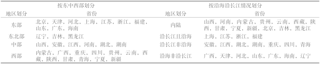 表2 按东中西和沿海沿长江情况的省份地区划分
