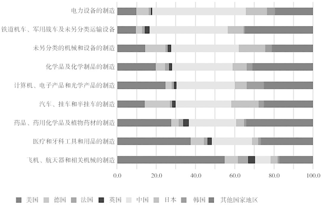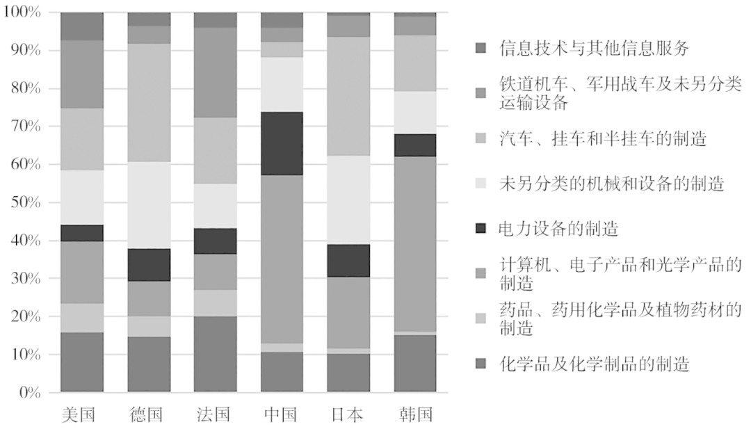 图11展示了四个全球主要经济体(美国、欧盟、中国和日本)在2002—2019年的技术密集型产业增加值份额。由图可见,在加入世界贸易组织后,中国的产业升级是全球产业升级最主要的动力之一。在2002—2019年,中国总体技术密集型产业附加值份额年增长1%,2019年规模基本与美国相当;中国制造业技术密集型产业附加值份额年增长1.3%,2019年规模相当于美国与日本之和。图12展示了技术密集型产业出口的全球分布情况。中美两国合计供给了全球53%的技术密集型产业出口,且在除计算机相关产业外有较为明显的产业链互补性。从研发强度层级上来看,中国位于技术密集型产业链中下游,而美国位于技术密集型产业链上游。中国出口世界份额最高的电力设备和铁道车辆产业的研发强度为技术密集型产业中研发强度层级最低的两个产业。而研发强度层级最高的三大产业:航天器、制药和计算机类产业中除计算机类产业外均由美国主导。图13展示了五个国家技术密集型的出口结构。其中,美国的出口结构较为平均,日本、德国和法国等在汽车和机械相关产业存在集聚,而中国和韩国则体现出在计算机等消费电子产业上的高度集聚。