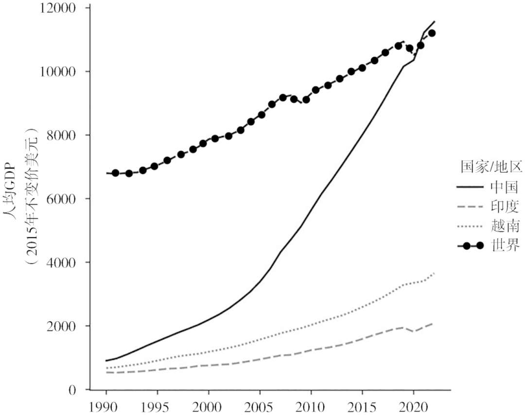 最后,改革开放以来中国经济的快速发展在提高国民收入的同时创造了国内超大规模的内部市场。由图10可见,在1990年中国的人均GDP仅为世界平均水平的13%,而到2022年已经达到了世界平均水平的102%。而同年的印度和越南的人均GDP仅为世界平均水平的18%和32%。这意味着未来的中国已经不是2001年刚加入世贸时期只能为外需生产而自身没有能力消费的国家。因此,除了持续扩大开放的外因优势和超大经济体量下内部产业转移的内因优势外,中国逐渐形成的强大内需在构成中国的产业韧性上也具有其他发展中国家无法替代的比较优势。