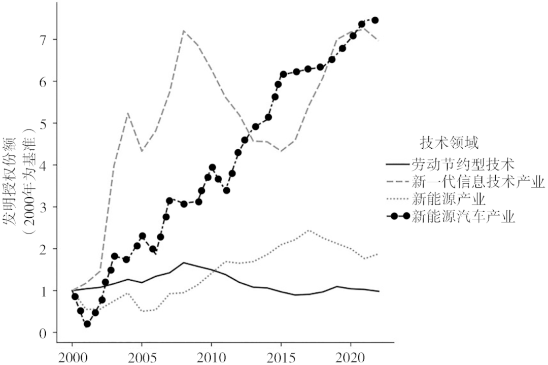 相比于信息技术产业,作为外贸“新三样”产业的新能源汽车和新能源产业发明授权份额虽然起步较低,但是发展速度显著快于劳动节约型技术。在2000年新能源汽车产业的技术授权份额仅为0.9%,至2022年这一份额已经提高到了6.5%。新能源产业在2007—2018年的增长速度较快,至2018年的授权份额达到了10%。但是从2018年开始,中国对光伏和风电等新能源产业补贴开始退坡,叠加中美贸易摩擦以来美国对中国光伏、风电和锂电池产业加征高额关税,中国新能源产业的技术进步开始放缓,至2022年中国新能源产业发明授权份额已减少到总授权量的8.5%,相当于2014年水平。从以上分析中不难发现,中国广延边际的技术进步速度虽然快于集约边际的劳动节约型技术,但是广延边际的技术进步存在着高度依赖外需和国家产业政策支持的问题。一旦遇到不可预期的外需萎缩(金融危机、中美贸易摩擦)或产业政策变化(光伏、风电补贴退坡),广延边际的产业升级就会出现大幅波动。