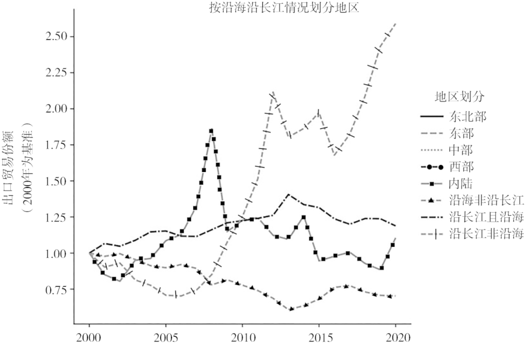 图8 2000—2020年中国分地区劳动密集型产品出口份额(2000年标准化为1)