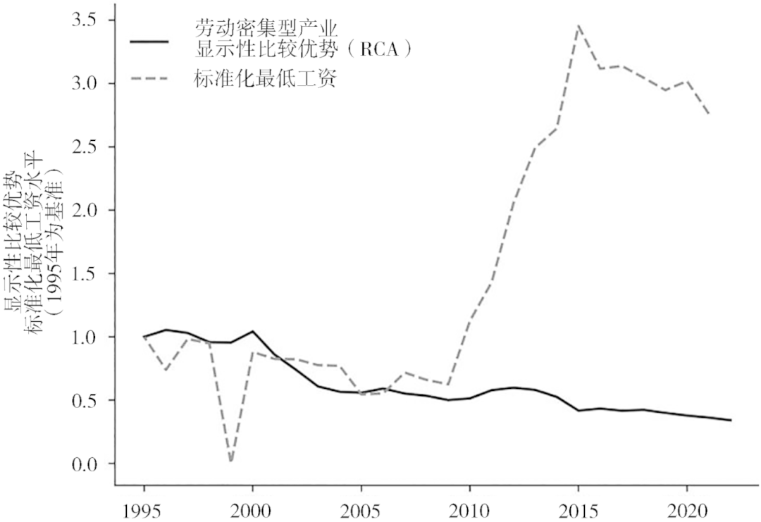 虽然2016年以来的经济下行因素延缓了中国最低工资水平的增长趋势,但是由图1可见,2007年的最低工资制度改革已经使得中国的最低工资水平远高于其余可能承接中国劳动密集型产业的南亚新兴经济体。为了厘清最低工资水平与中国劳动密集型产业比较优势的关系,本文以1995年作为基准,在图2展示了中国最低工资水平和劳动密集型产业显示性比较优势的演变情况。可以看到,中国在劳动密集型产业上比较优势随着产业结构转型和出口的多元化而持续下降,但2007—2015年最低工资水平的大幅提升并没有冲击到中国在劳动密集型产业上的比较优势。我们从2007年最低工资制度改革这一“自然实验”可以得到的结论是,低劳动力成本水平并不是中国劳动密集型产业形成比较优势的最主要原因。产业链的完备性、熟练的技术工人规模、公共品投资、产业政策和贸易政策都会影响到一个国家的比较优势。经过几十年全球产业链在中国的锻造和其他优势的凸显,低劳动力成本不构成当前中国劳动密集型产业比较优势主要因素的逻辑,同样可以解释为什么劳动密集型产业会集聚在中国而不是非洲等劳动力成本更低的国家地区。