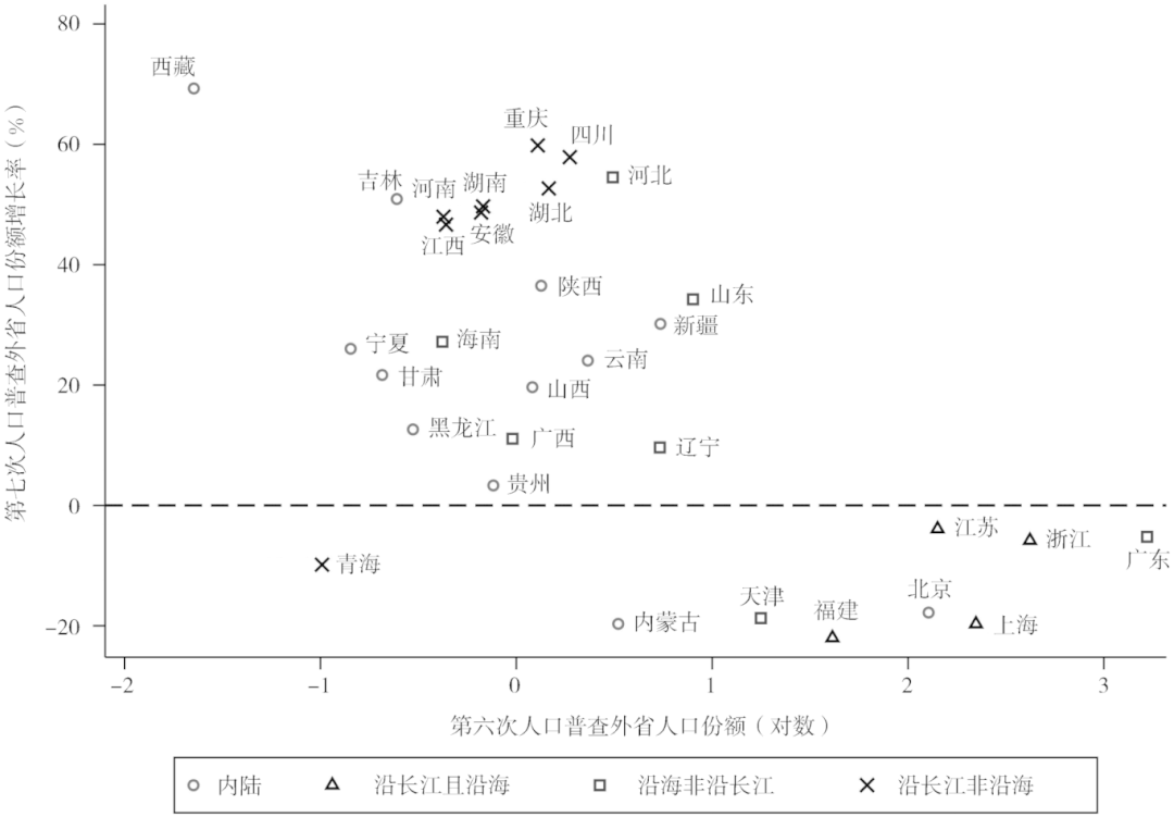 中国劳动密集型产业转移依据比较优势而进行的资源再配置还带动了金融危机后中国内部劳动力流动转向。图9通过第六次到第七次人口普查期间中国各省的外省人口占全国份额的变化情况来反映中国内部劳动力的流动情况。和传统产业升级理论预期的东西向劳动力流动不同,现实中东部沿海地区对于国内流动劳动力的吸收能力已经趋于饱和。第七次人口普查中所有东部沿海地区的外省人口份额都没有在第六次人口普查的基础上继续提高。由图9可见,2010年到2020年的外省人口分布变化体现为东部沿海地区下降,内陆地区上升的格局。而在其中外省人口份额增长率最高的地区正是我们在前文所分析的沿长江非沿海地区。这表明,金融危机以来中国的内部产业转移不仅体现为产业和资本基于比较优势的重新配置,还同时带动内部劳动力流动的新趋势。这种由产业转移主导的内部劳动力流动,如果没有中国这样既具超大规模经济体量又具区域经济发展差异的背景,是难以实现的。