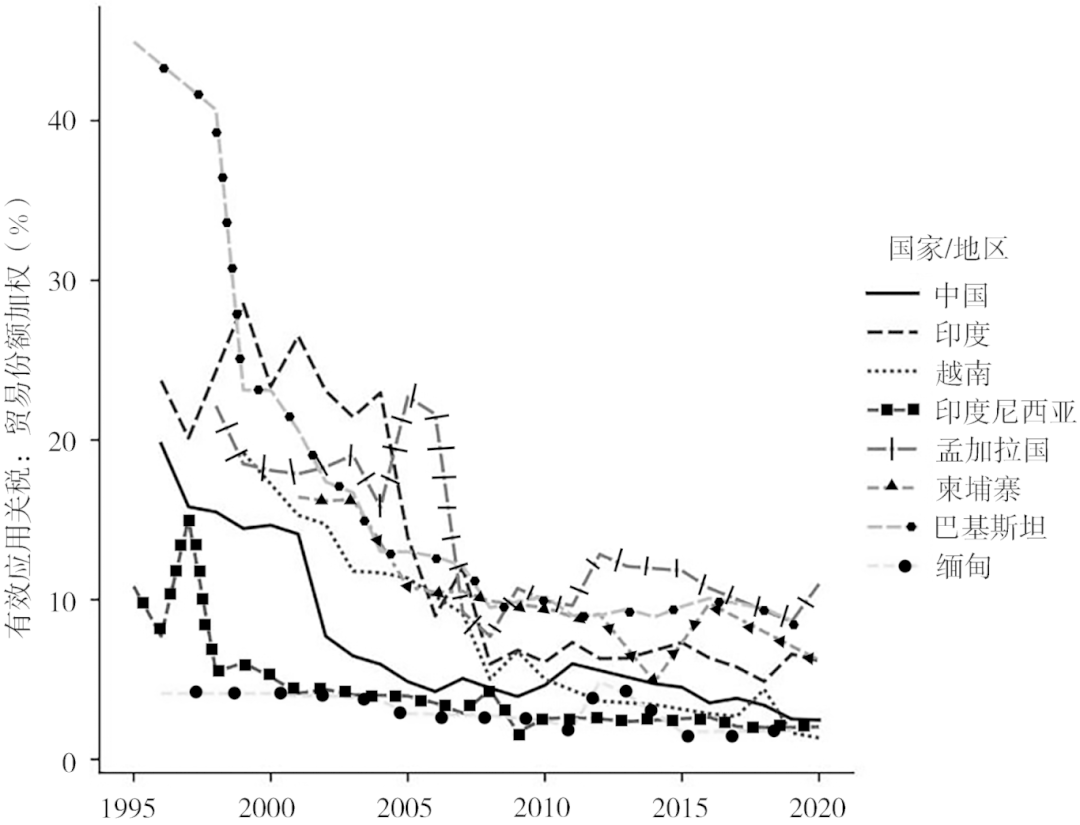 图5 1995—2020年八个代表性新兴经济体的有效应用关税