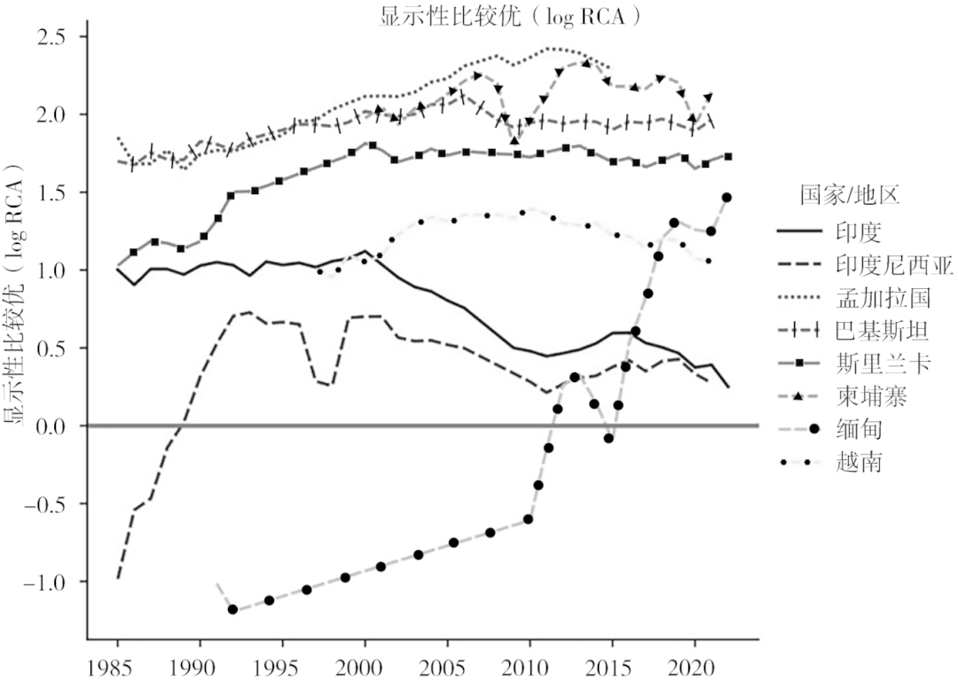 图4 1985—2022年南亚及东南亚新兴经济体的劳动密集型产业份额与比较优势