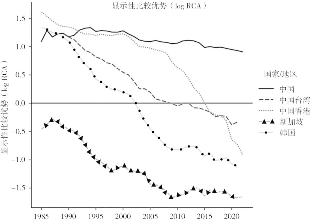 图3 1985—2022年中国与“亚洲四小龙”的劳动密集型产业份额与比较优势